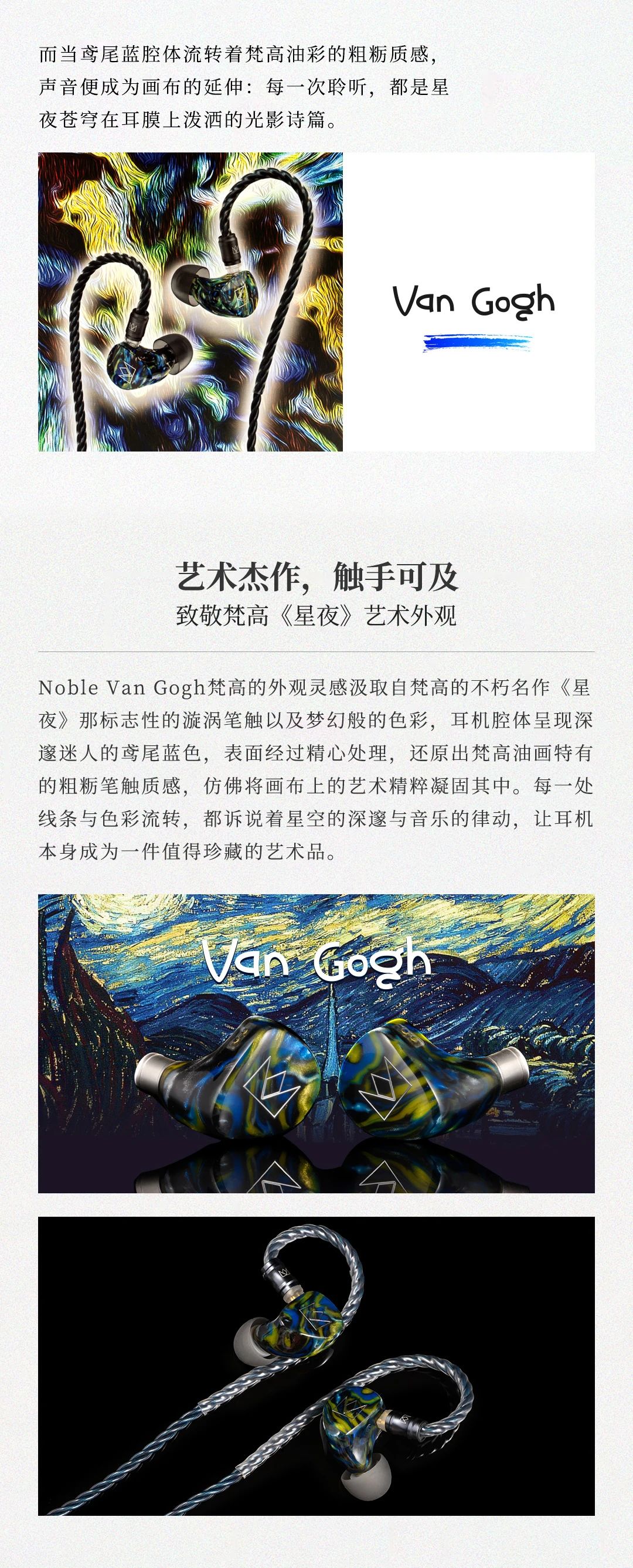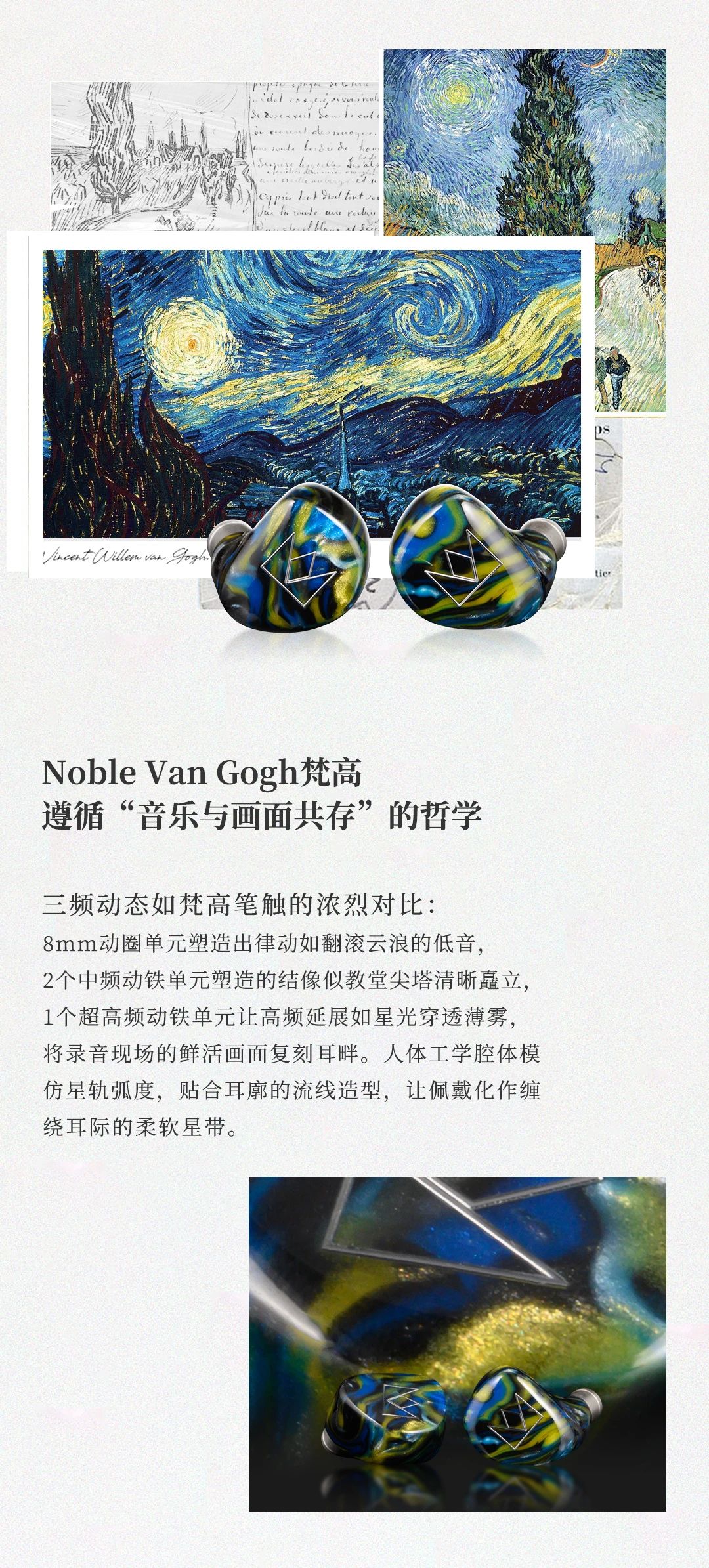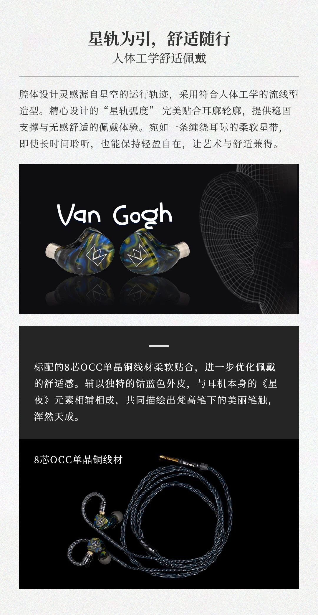 Van Gogh 梵高耳機(jī)以梵高名作《星夜》為靈感,將鳶尾藍(lán)腔體的粗糲油彩質(zhì)感與星空漩渦般的人體工學(xué)設(shè)計(jì)融合,打造可穿戴的藝術(shù)單品。聲學(xué)上采用 4 單元混合架構(gòu) ——8mm 雙磁路動(dòng)圈單元帶來(lái)如翻滾云浪的低頻律動(dòng),2 顆 Sonion 動(dòng)鐵單元精準(zhǔn)呈現(xiàn)中頻人聲的細(xì)膩情感,1 顆 Knowles 極高頻動(dòng)鐵單元演繹星光穿透薄霧般的高頻延展,三頻動(dòng)態(tài)對(duì)比鮮明如梵高筆觸,搭配 107dB 靈敏度與 29Ω 阻抗,手機(jī)直推即可釋放 20Hz-20kHz 全頻段鮮活聽(tīng)感。星軌弧度腔體貼合耳廓,8 芯 OCC 單晶銅線材呼應(yīng)畫作元素,讓佩戴成為纏繞耳際的舒適星帶。