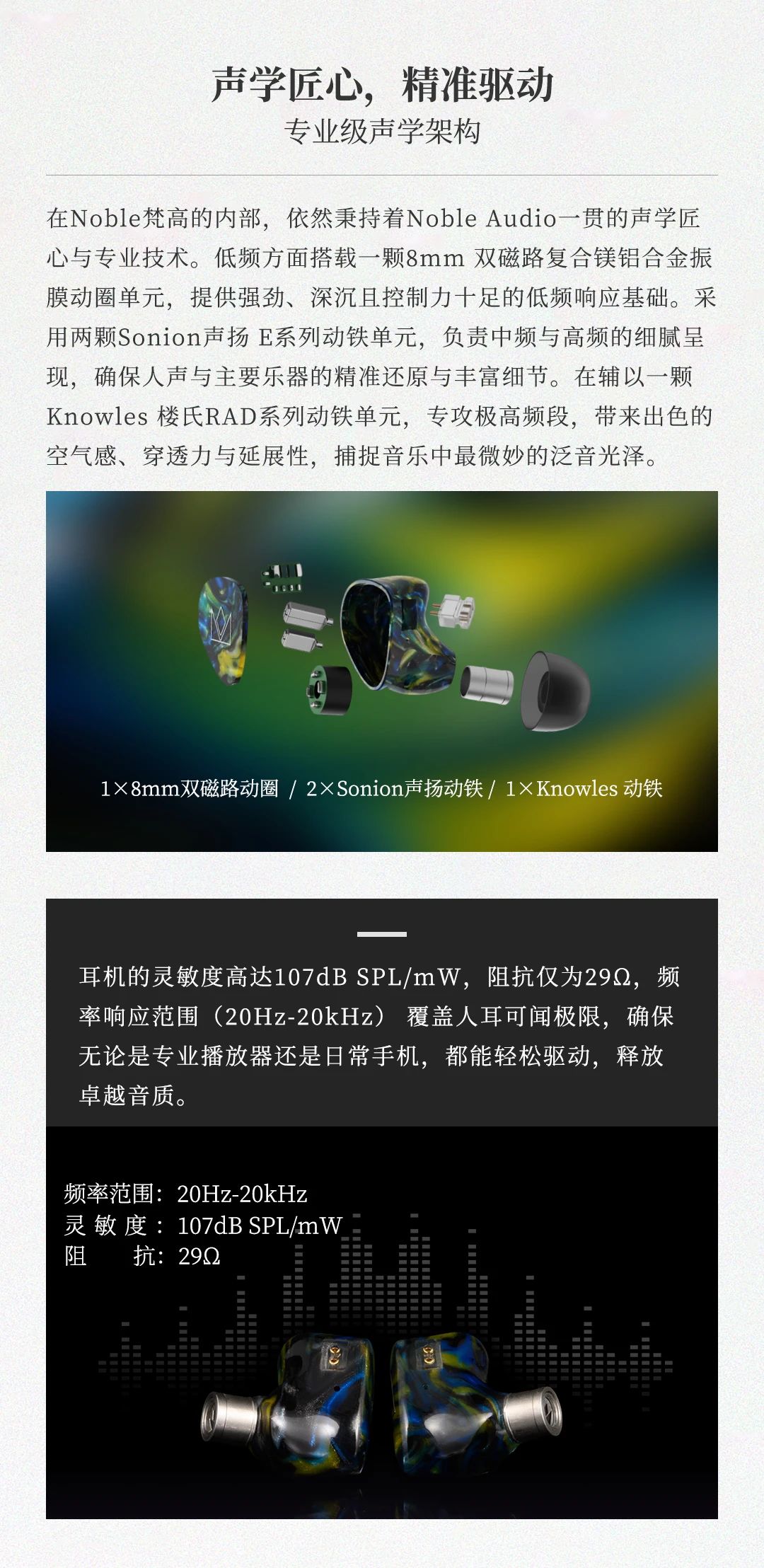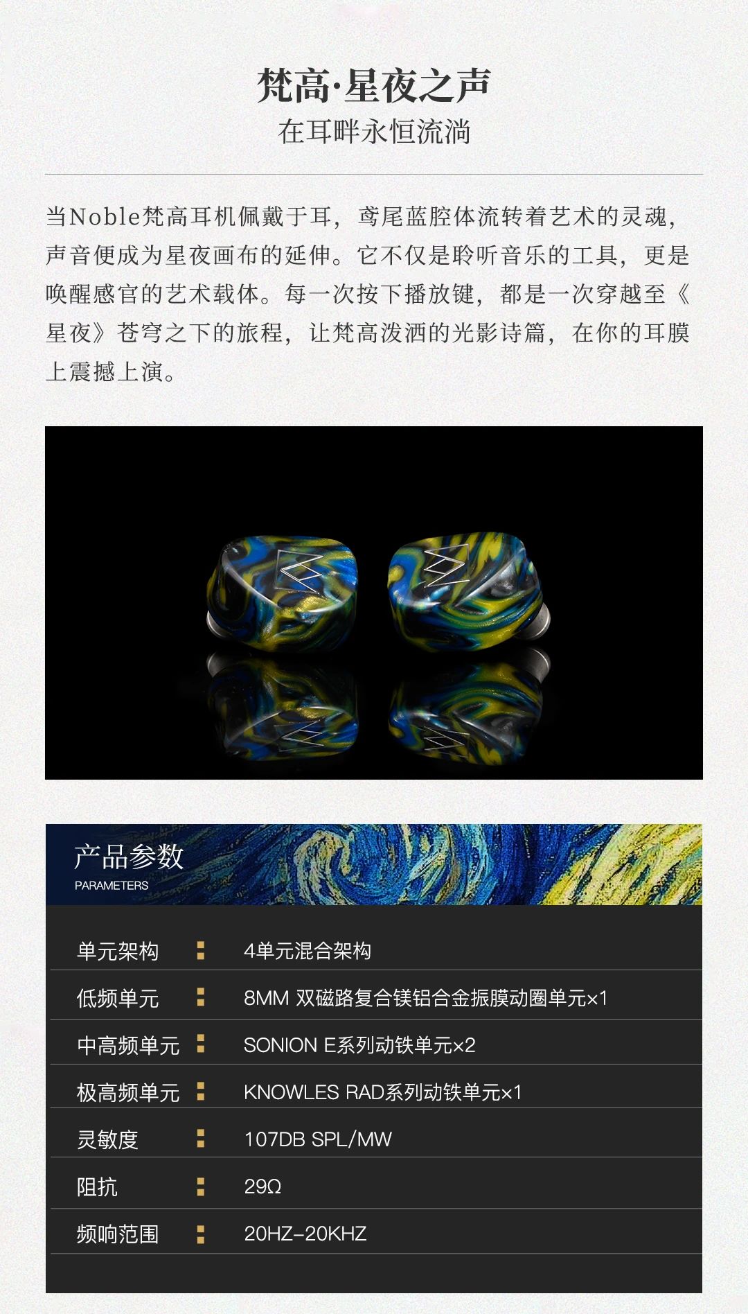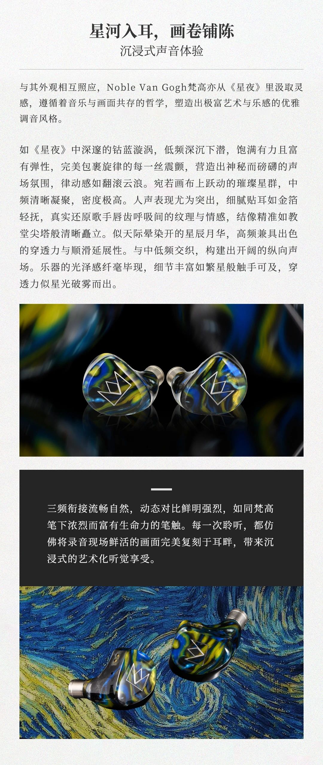 Van Gogh 梵高耳機(jī)以梵高名作《星夜》為靈感,將鳶尾藍(lán)腔體的粗糲油彩質(zhì)感與星空漩渦般的人體工學(xué)設(shè)計(jì)融合,打造可穿戴的藝術(shù)單品。聲學(xué)上采用 4 單元混合架構(gòu) ——8mm 雙磁路動(dòng)圈單元帶來(lái)如翻滾云浪的低頻律動(dòng),2 顆 Sonion 動(dòng)鐵單元精準(zhǔn)呈現(xiàn)中頻人聲的細(xì)膩情感,1 顆 Knowles 極高頻動(dòng)鐵單元演繹星光穿透薄霧般的高頻延展,三頻動(dòng)態(tài)對(duì)比鮮明如梵高筆觸,搭配 107dB 靈敏度與 29Ω 阻抗,手機(jī)直推即可釋放 20Hz-20kHz 全頻段鮮活聽(tīng)感。星軌弧度腔體貼合耳廓,8 芯 OCC 單晶銅線材呼應(yīng)畫作元素,讓佩戴成為纏繞耳際的舒適星帶。